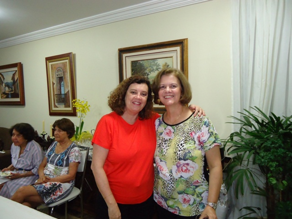 A aniversariante com sua amiga Zilma Maria Ribeiro Pinto, que levou um presente artesanal que fez o maior sucesso.