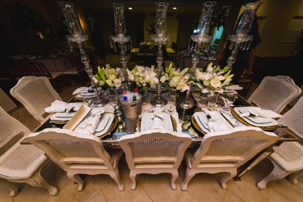 No interior dos salões de festas do Espaço das Nações, a dica é: muitas flores, como rosas brancas e nos tons nude, fazem par perfeito com os cristais.