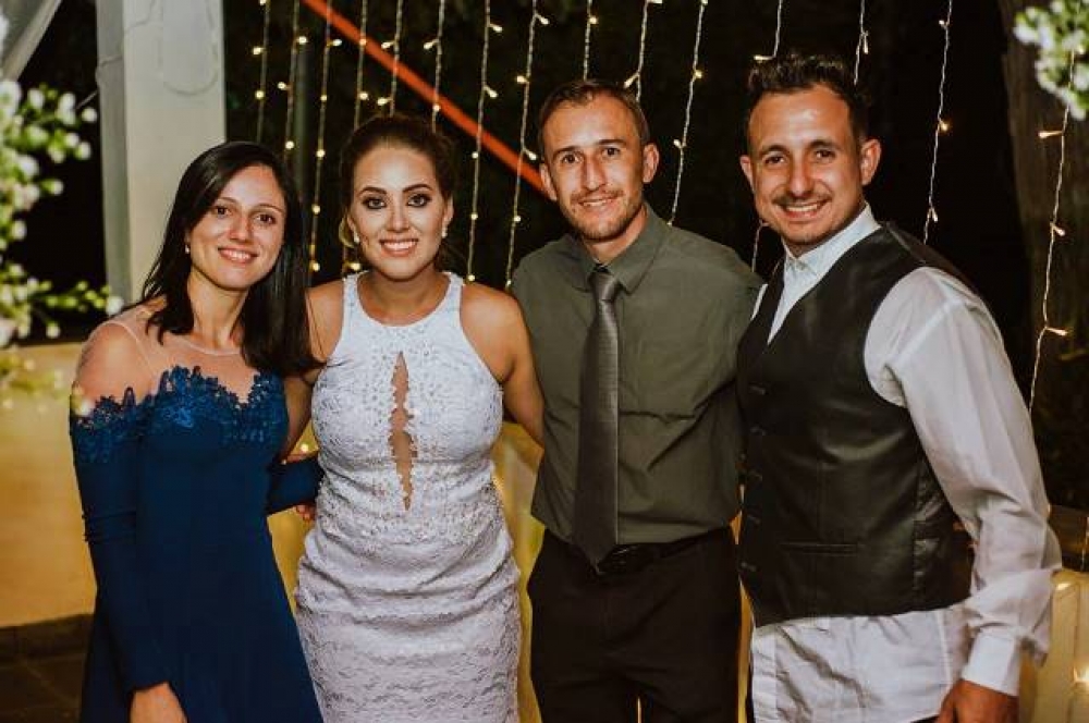Os noivos com seus padrinhos. destaque para a madrinha, Fernanda Mantovani.