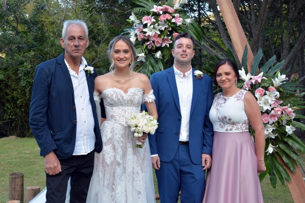 Testemunhando este momento importante, estavam os pais da noiva, Dirce Maria Santos Santiago e Márcio Santiago, e os pais do noivo, Vânia Cristina Gomes Martins e Mauro Barbosa Martins Filho.