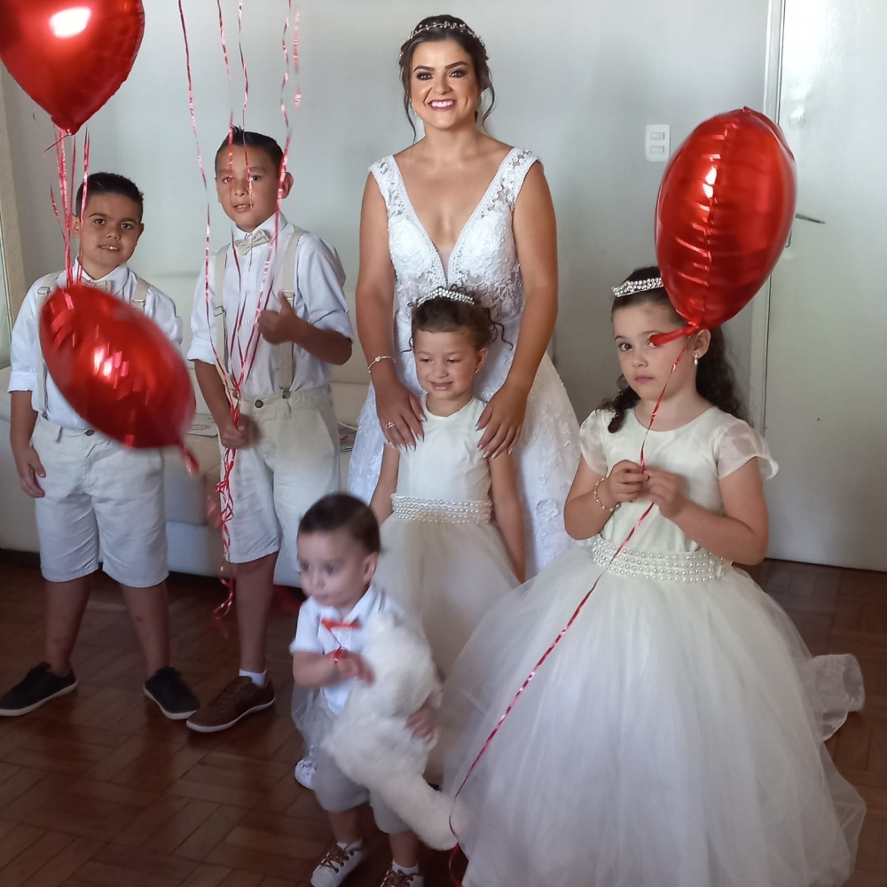 O look da noiva durante a cerimônia e das daminhas ficaram por conta da loja Exclusiva Noiva & Festas. Após a cerimônia, durante a festa, o look ficou por conta da loja Márcia Noivas & Festas. Lívia entrou de braços dados com seu pai, Sr. Mauro Eli da Silva.