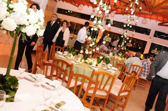 Os noivos escolheram o tom branco e o verde. Esses tons, claro, predominaram nas flores e em todos os detalhes da festa.