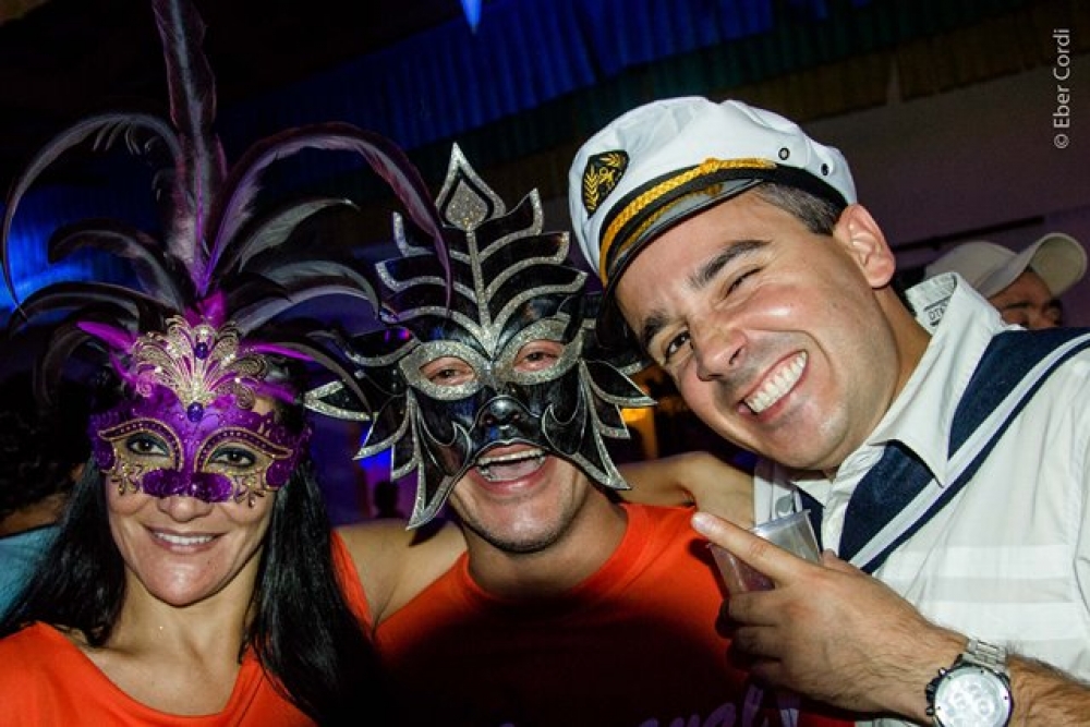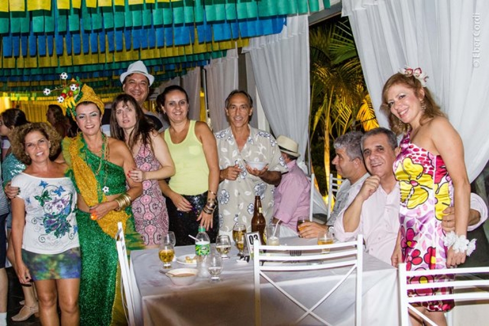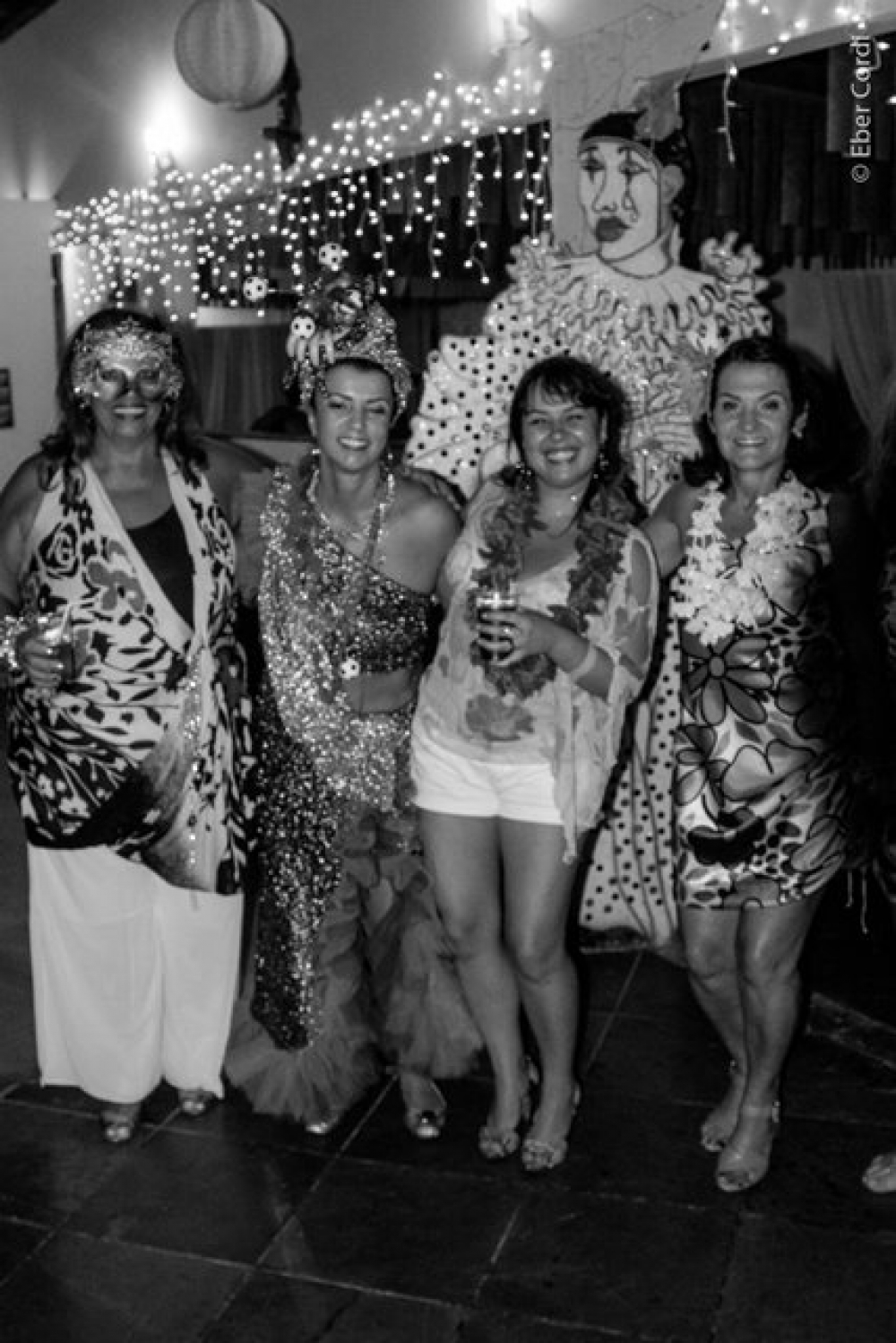 Cátia reinando no baile ao lado do marido, dos amigos, e da anfitriã.