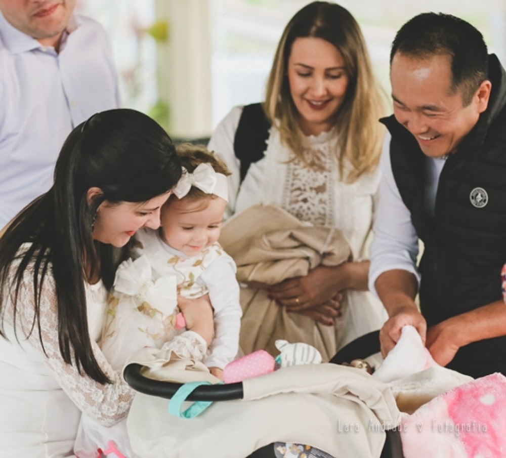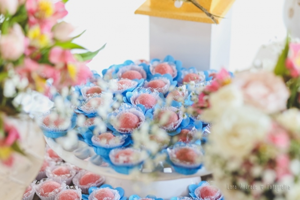 A mesa do bolo foi destaque na festa. O carinho da mamãe de Laís foi notado nos mínimos detalhes da decoração. Foi ela quem fez as casinhas de passarinhos, abajures de flores, lembrancinhas, bolo e toda a parte da papelaria da festa como: convites, caixinhas de pipoca e batata frita, livrinho para colorir, cardápio e tags. O bolo foi feito com pasta americana. As flores deram um efeito visual muito bonito.