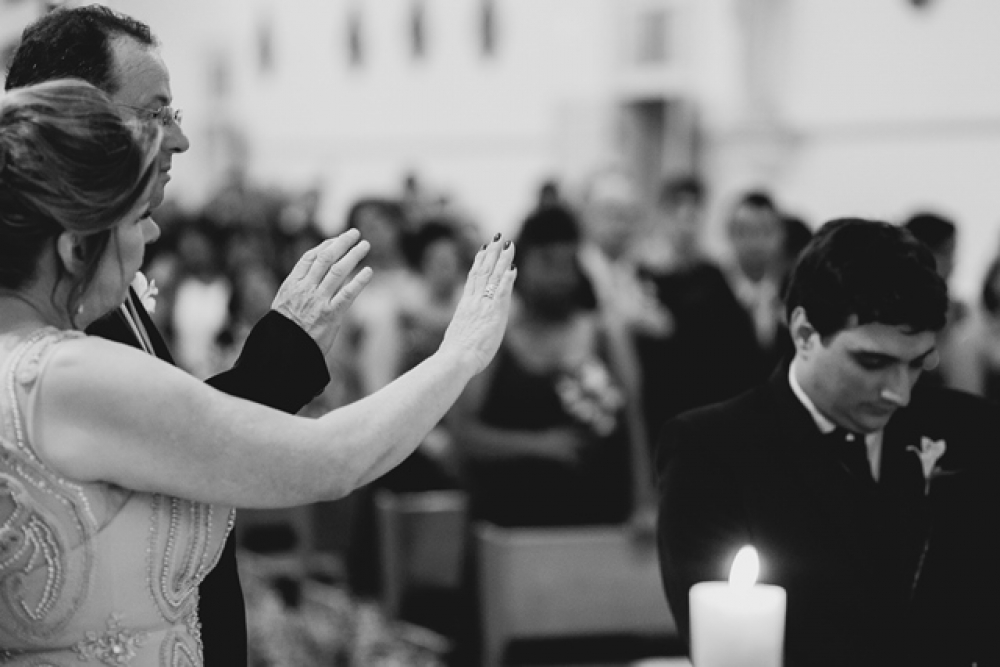 Os pais do noivo, a Sra. Heliane Helena de Carvalho Aguiar e o Sr. José Henrique de Aguiar, também abençoam.